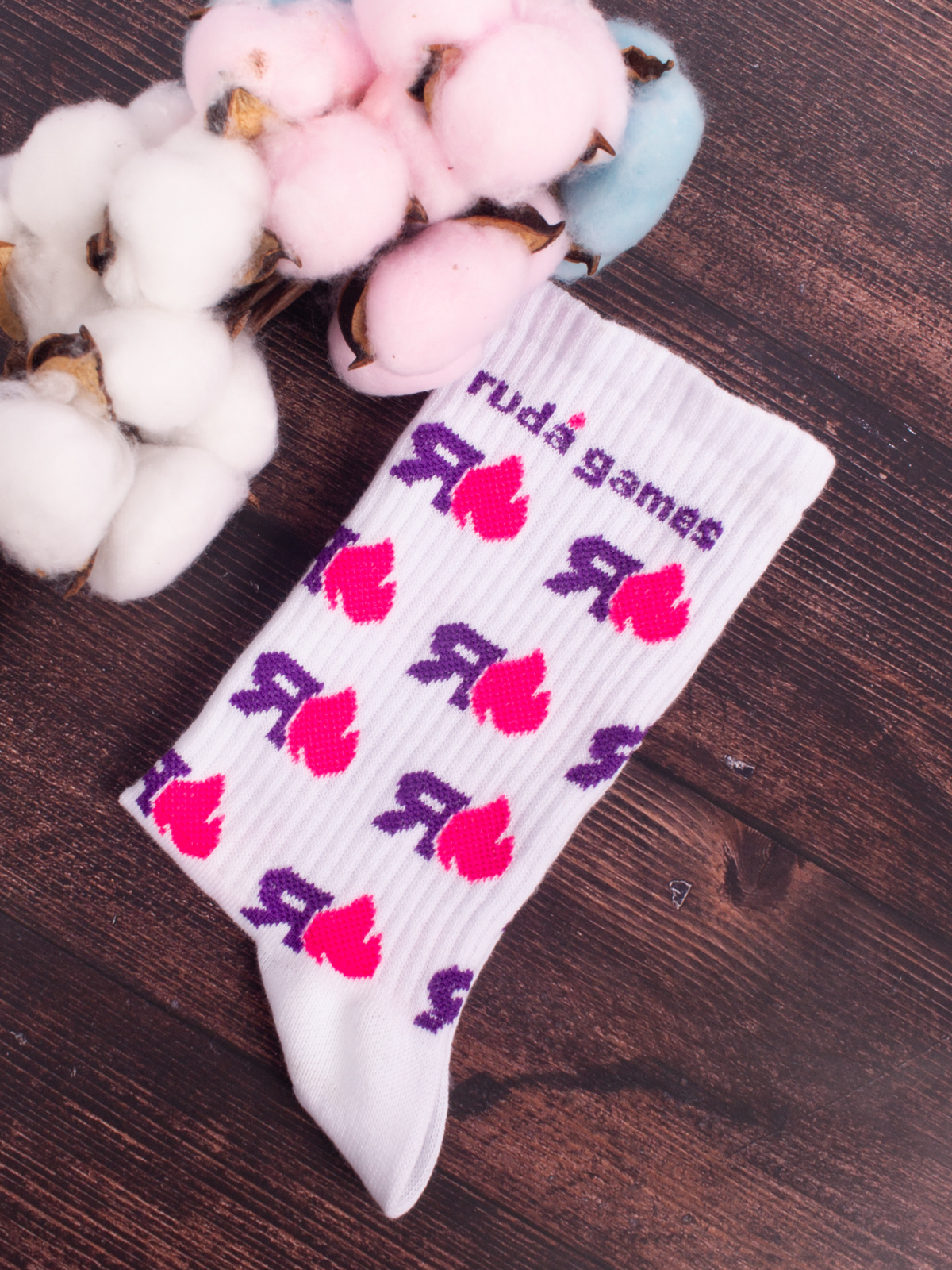Изготовили 2000 пар носков для международной компании Ruda Games, работающей в сфере игр, медиа и образования. Стильные белые спортивные модели с запоминающимся дизайном, а точнее фиолетовая буква «Я», разработанная в соответствии с фирменным стилем Ruda Games, дополненная игривым розовым огоньком, добавляющим динамичности и позитива.