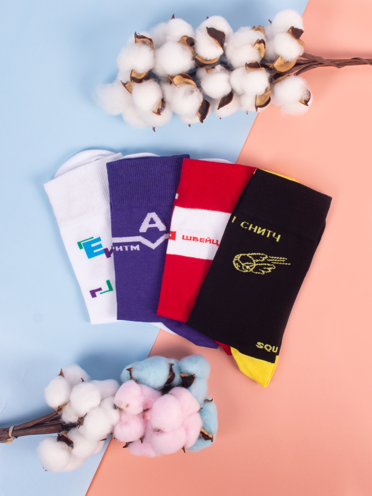 SQUIZ знают толк в интеллектуальных играх, а мы – в создании запоминающегося мерча! Показываем, как мы связали эти два мира. Мы создали для них уникальные партии носков, отражающие дух игры и ее участников. На фото – лишь часть нашей совместной работы. При заказе носков, каждый раз мы делали для них уникальный, индивидуальный дизайн с подписью SQUIZ на стопе или возле нее. Вот дизайны некоторых из них: белые с буквами ЕиЕ и другими фрагментами, фиолетовые носки с белым мыском и с надписью "Алкоритм", черные носки с желтой пяткой и мыском и текстом "Я поймал снитч", на которых вывязан рисунок летающего мяча с крыльями, и красные носки с белым мыском "Сборная Швейцария".