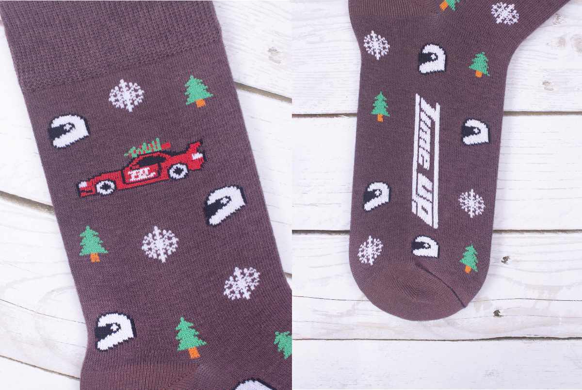 Для команды TimeUp, объединенной страстью к скорости и дрифту, мы создали эксклюзивную партию новогодних фирменных носков, ставших ярким элементом корпоративной культуры. Дизайн, сочетающий коричневый фон, гоночную машину с елкой, логотип TimeUp и праздничные элементы (елочки, шлемы, снежинки), был разработан с учетом всех пожеланий клиента.